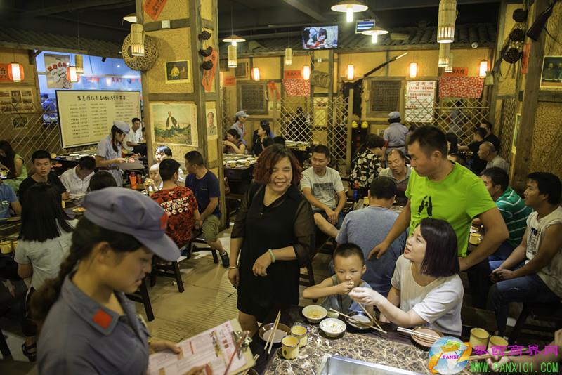 走進“紅軍”陣地,這里的一切景象就給我們一種穿越時空的感覺。這樣的氛圍帶著我們穿越回那些難忘的年代。一副副窗簾、門簾都掛著藍色、紅色土麻花布。席間的木墻柱、木桌椅、土碗盞……無一不是土色土香,無一不是復古的元素。各個雅間門上都以大院命名:賴家大院、馬家大院……廳堂、雅間內的墻面上貼著一些懷舊的圖畫:毛主席語錄,八大元帥照片,毛主席的照片……
