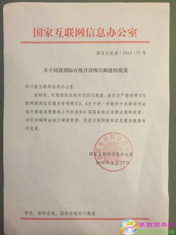 2016年8月27日,國信辦發(fā)函,國家互聯(lián)網(wǎng)信息辦公室同意國際在線開設(shè)四川頻道,標(biāo)志著又一家中央重點新聞網(wǎng)站——國際在線落戶四川的地方頻道——四川頻道從事互聯(lián)網(wǎng)新聞信息服務(wù)取得合法牌照。