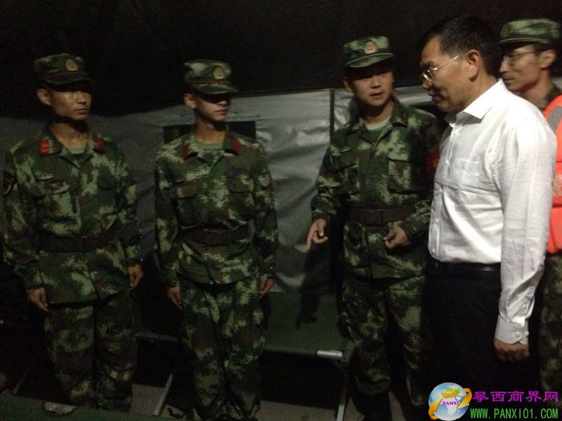 2016年9月23日晚上7點(diǎn)30分,攀枝花市市長(zhǎng)來(lái)到仁和區(qū)大田鎮(zhèn)214省道被山洪沖毀的搶險(xiǎn)點(diǎn),看望正在連夜加班加點(diǎn)作業(yè)的武警水電第九支隊(duì)官兵,詢問(wèn)災(zāi)情和道路修復(fù)進(jìn)度情況。8點(diǎn)10分,來(lái)到了武警水電第九支隊(duì)宿營(yíng)地看望慰問(wèn)營(yíng)地?fù)Q班休整的官兵??吹轿渚姽俦≡趲づ窭镉H切的問(wèn):"有沒(méi)有地方洗澡?",九支隊(duì)后勤處副處長(zhǎng)趙云回答:"我們自己帶有凈水車和淋浴車,能夠滿足官兵的洗浴要求"。后勤處副處長(zhǎng)趙云和一大隊(duì)教導(dǎo)員唐義夫還就搶險(xiǎn)任務(wù)、完成情況、后勤保障等一一做了介紹。