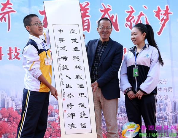 報(bào)告會(huì)結(jié)束后,攀枝花市三中學(xué)生代表學(xué)校向俞敏洪董事長(zhǎng)獻(xiàn)上自己書寫的“追求卓越,挑戰(zhàn)極限,從絕望中尋找希望,人生終將走向輝煌”這一新東方精神的書法作品,表達(dá)了全體師生對(duì)他的敬意。