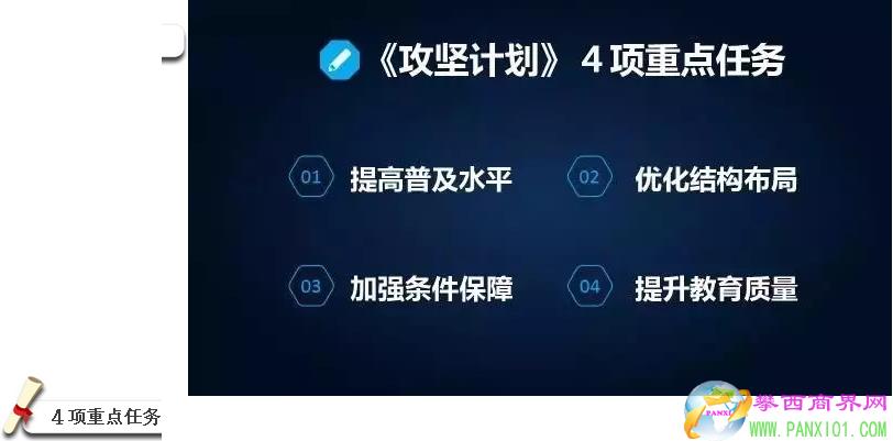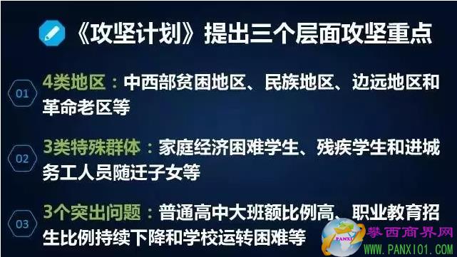 重點是提高教育基礎薄弱特別是高中階段教育毛入學率較低地區(qū)的普及程度,提高特殊群體接受高中階段教育的機會,解決有學上的問題。