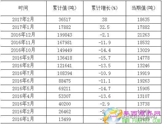 據(jù)數(shù)據(jù)庫(kù)數(shù)據(jù)顯示,2017年1-2月我國(guó)鈦白粉進(jìn)口量累計(jì)36517噸,同比增長(zhǎng)38%,其中2月進(jìn)口量為18635噸。