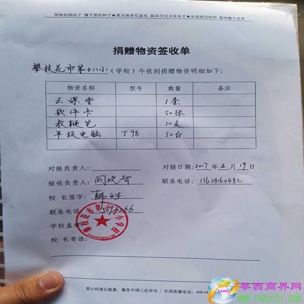 攀西商界網(wǎng)(攀枝花市工商聯(lián)經(jīng)濟(jì)聯(lián)絡(luò)部 陳忠榮)4月19日,由省工商聯(lián)、省光彩會(huì)、省老促會(huì)、明日之星教育基金會(huì)和四川山東商會(huì)等單位共同發(fā)起的“班班通助力教育信息化——四川省光彩事業(yè)行”來到攀枝花市西區(qū),在市第十八小學(xué)校開展精準(zhǔn)扶貧捐贈(zèng)活動(dòng)。