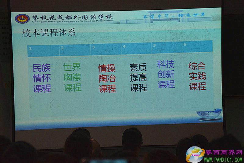 會(huì)議室座無(wú)虛席,還有的家長(zhǎng)是站著聽(tīng)了2個(gè)多小時(shí)的專(zhuān)題報(bào)告。據(jù)攀枝花市成都外國(guó)語(yǔ)學(xué)校副校長(zhǎng)王維榮介紹,該校校本課程體系全面而豐富,與傳統(tǒng)教育有著顯著的區(qū)別: