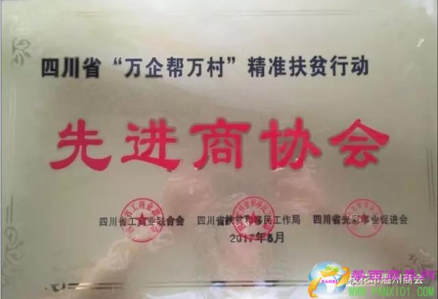 2017年5月,攀枝花市溫州商會(huì)在四川省“萬企幫萬村”精準(zhǔn)扶貧工作中率先垂范、成績(jī)突出,被四川省工商聯(lián)、四川省扶貧和移民工作局、四川省光彩事業(yè)促進(jìn)會(huì)評(píng)為“萬企幫萬村”精準(zhǔn)扶貧行動(dòng)“先進(jìn)商協(xié)會(huì)”。 在參加此次評(píng)選的攀枝花市商協(xié)會(huì)中,攀枝花市溫州商會(huì)為唯一一家受到表彰的商協(xié)會(huì)。