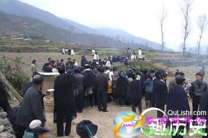 在槍聲陪伴下主方抬起砣砣肉和蕎餅,讓客人自由組合成團(tuán),不分男女老幼,不管相識(shí)或相關(guān)與否,按人頭分給一份砣砣肉、蕎餅或米飯。待到在場(chǎng)的人都得到一份時(shí),主人鳴槍,大聲宣布喪事圓滿結(jié)束,并勸各路賓客回到村寨吃點(diǎn)便餐再走。至此,有宴者可以赴宴,無宴者可以歸家,整個(gè)喪葬儀式便告完成。