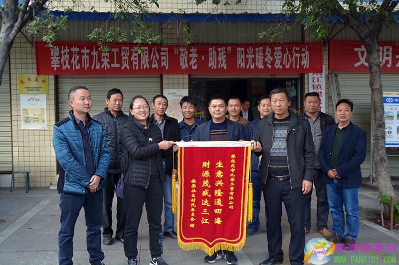 送人玫瑰,手有余香。東區(qū)銀江鎮(zhèn)倮果村黨支部書記劉運紅、村委會主任陳家園代表村民向九榮工貿公司贈送了錦旗,真誠祝愿企業(yè)“生意興隆通四海,財源茂盛達三江”。