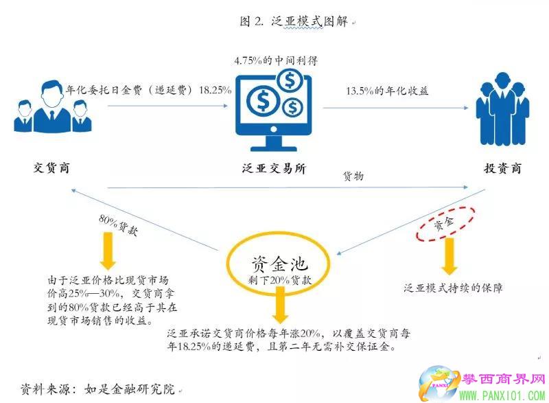在交易所非法集資案件中,涉案規(guī)模和影響最大的是昆明泛亞有色金屬交易所。昆明泛亞通過金屬現(xiàn)貨投資和貿(mào)易平臺,自買自賣,操控平臺價格,維持泛亞的價格比現(xiàn)貨市場價高25%—30%,每年上漲約20%,制造交易火爆的假象,然后借此包裝所謂“日金寶”等誘人的高收益產(chǎn)品。但實際上每年漲價20%只是為了讓泛亞的價格永遠高于現(xiàn)貨市場價格,因此也永遠不會有真正的買方,并沒有帶來實際增量資金;而交貨商也因此不需補交保證金,投資者年化13.5%的日金寶理財收益,都是自己的本金或者新增投資者的本金。當新增資金放緩或者停止進入時,整個體系就會崩盤,投資者基本血本無歸。泛亞模式就是利用新投資人的錢來向老投資者支付委托日金費和短期回報,制造賺錢的假象進而騙取更多的投資。2015年12月,昆明泛亞兌付危機爆發(fā),涉及28個省份的22萬人,非法集資金額總計超過430億元,上千名泛亞投資者聚集在證監(jiān)會門口集會抗議。