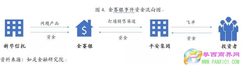 其中涉案規(guī)模最大,最為引人注目的是金賽銀基金事件。2015年10月,深圳金賽銀基金管理有限公司陷入60億元兌付危機中,金賽銀負責(zé)人王維奇跑路,客戶的幾十億資金無處追討,無處申訴;而平安人壽被曝由其業(yè)務(wù)員向客戶兜售的巨額金賽銀理財產(chǎn)品無法兌付。通過高檔豪華會所裝門面、拉攏政府官員打著政府項目的旗號推銷、打平安保險擔(dān)保的幌子、宣傳公司掛牌上海股交中心等方式,金賽銀公司吸引了大量投資者購買其理財產(chǎn)品,但這些錢實則進入了王維奇的個人私款。這一事件的背后,存在著一條“有毒資產(chǎn)”轉(zhuǎn)嫁鏈條:信托公司把信托貸款、債權(quán)等問題產(chǎn)品轉(zhuǎn)給第三方私募接盤;私募公司金賽銀通過動員平安員工“接飛單”等方式,打通了平安集團的銷售渠道,募得巨額資金,最終挪作它用,導(dǎo)致原本就存在問題的資產(chǎn)鏈條斷裂。