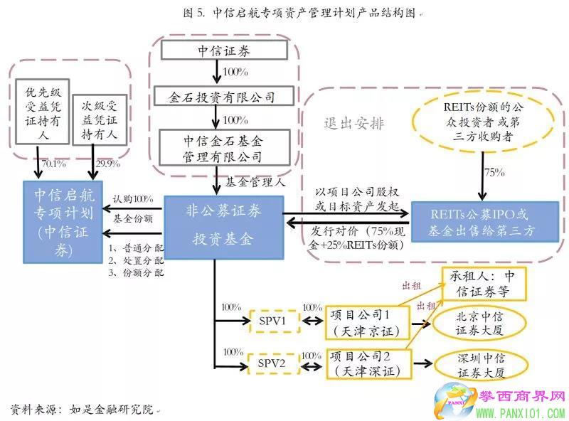 而規(guī)范的金融產(chǎn)品,盡管其結(jié)構(gòu)設(shè)計較為復(fù)雜,卻有容易變現(xiàn)的底層資產(chǎn)作為保障。以國內(nèi)首只REITs中信啟航為例,其資產(chǎn)結(jié)構(gòu)較為復(fù)雜,卻十分清晰,擁有北京、深圳的中信證券大廈的租金收入作為底層資產(chǎn)。在這一產(chǎn)品中,中信證券首先在天津注冊成立兩家全資子公司——天津京證、天津深證,然后將北京中信證券大廈、深圳中信證券大廈的房地產(chǎn)權(quán)屬分別過戶天津京證、天津深證,之后再將天津京證、天津深證的全部股權(quán)轉(zhuǎn)讓給中信金石基金管理有限公司擬發(fā)起設(shè)立的非公募基金的全資孫公司中信金石基金。中信金石基金作為非公募基金的投資載體,向中信證券收購天津京證和天津深證的股權(quán),以達到為非公募基金的投資者提供投資業(yè)務(wù)的目的。另一方面,中信證券成立中信啟航專項資產(chǎn)管理計劃,募集資金100%認購基金份額,按70.1%:29.9%的比例劃分為優(yōu)先級和次級,向非公募基金出資。項目公司獲取的租金收入用于分配專項資管計劃的收入。