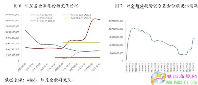 而一些正規(guī)投資渠道的項目或理財產(chǎn)品,往往不會存在反復(fù)融資的情況,大多會將融資規(guī)??刂圃谝欢ǚ秶鷥?nèi)。從圖6列舉的五只明星基金的募集份額情況來看,東方紅睿滿滬港深、東方紅睿華滬港深、東方紅滬港深、東方紅中國優(yōu)勢的募集份額均維持得十分平穩(wěn),其中前兩只基金的份額在成立以來均維持不變,東方紅中國優(yōu)勢的份額甚至還有下降。興全趨勢投資混合基金的募集份額雖然在近兩年來有較快的增長,但其募集份額規(guī)模較更早時候的2008年來看,也有明顯的下滑;2008年3月31日,該基金的募集份額一度高達20536270957份。