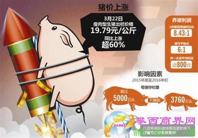 根據(jù)農(nóng)業(yè)部公布的數(shù)據(jù),2015年3月31日,全國(guó)生豬出欄均價(jià)為11.6元/公斤,一年的時(shí)間,同比劇增70%。上周(3月28日-4月3日)全國(guó)36個(gè)大中城市豬肉平均批發(fā)價(jià)格為每公斤25.34元,比前一周上漲0.4%創(chuàng)下2011年10月末以來(lái)新高.