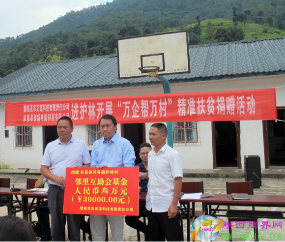活動(dòng)中,通過第一書記前期摸排調(diào)查牽線搭橋,兩個(gè)企業(yè)詳細(xì)了解了護(hù)林村目前就讀學(xué)生的家庭、學(xué)習(xí)、生活情況。攀枝花市正源科技有限責(zé)任公司向護(hù)林村捐贈(zèng)鄰里互助會(huì)基金3萬元(人民幣),主要用于補(bǔ)助87戶建檔立卡貧困戶及低保困難家庭子女就讀高中、大學(xué)學(xué)費(fèi)及生活費(fèi)等費(fèi)用;米易縣創(chuàng)新電腦科技公司捐贈(zèng)雙肩包50個(gè),主要用于高中以上學(xué)生使用。此次活動(dòng),共有72名學(xué)生受益,