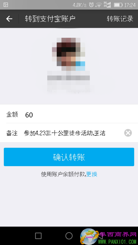 輸入金額:60元整;備注:參加4.23三十公里徒步活動,(自己的真實姓名)