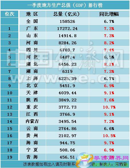 從中國經(jīng)濟(jì)網(wǎng)記者制作的一季度地方生產(chǎn)總值(GDP)排行榜中可以看出,目前榜單總量前三名的是廣東、山東、河南,其中廣東GDP總量17272.24億元穩(wěn)居全國第一,山東GDP總量14914.8億元暫居第二,河南GDP總量8284.26億元暫居第三。