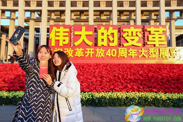 12月18日,參觀者在“偉大的變革——慶祝改革開放40周年大型展覽”外自拍留影。新華社記者 張玉薇 攝