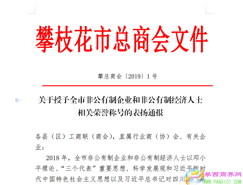為總結(jié)經(jīng)驗(yàn),鼓勵(lì)先進(jìn),樹(shù)立典型,營(yíng)造全社會(huì)關(guān)心支持非公有制經(jīng)濟(jì)發(fā)展的良好氛圍,市工商聯(lián)(總商會(huì))按照《攀枝花市非公有制經(jīng)濟(jì)榮譽(yù)申報(bào)辦法(2018)》,本著公開(kāi)、公正、平等的原則,經(jīng)企業(yè)自主申報(bào)并征求相關(guān)部門(mén)意見(jiàn),決定授予:張璽等21人為“2018年度攀枝花市優(yōu)秀民營(yíng)企業(yè)家”、卜凡等13人為 “2018年度攀枝花市優(yōu)秀職業(yè)經(jīng)理人”、 四川安寧鐵鈦股份有限公司等30戶企業(yè)為“2018年度攀枝花市誠(chéng)信企業(yè)” 、四川龍蟒礦冶有限責(zé)任公司等10戶企業(yè)為“2018年度‘萬(wàn)企幫萬(wàn)村’/‘千企幫千村’精準(zhǔn)扶貧行動(dòng)先進(jìn)單位”、 攀枝花市綠色建材發(fā)展協(xié)會(huì)等23戶企業(yè)(商/協(xié)會(huì))為“2018年度攀枝花市光彩事業(yè)先進(jìn)單位”(具體名單附后)。