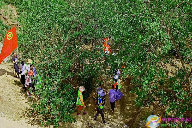 啟動儀式后,重走長征路的隊伍,沿著紅軍當(dāng)年翻山過來下坡行軍的路線,踏上征程。排頭兵南廠村紀(jì)檢組長萬德才同志(右圖最前帶路者),扛旗帶領(lǐng)隊伍走向勝利!