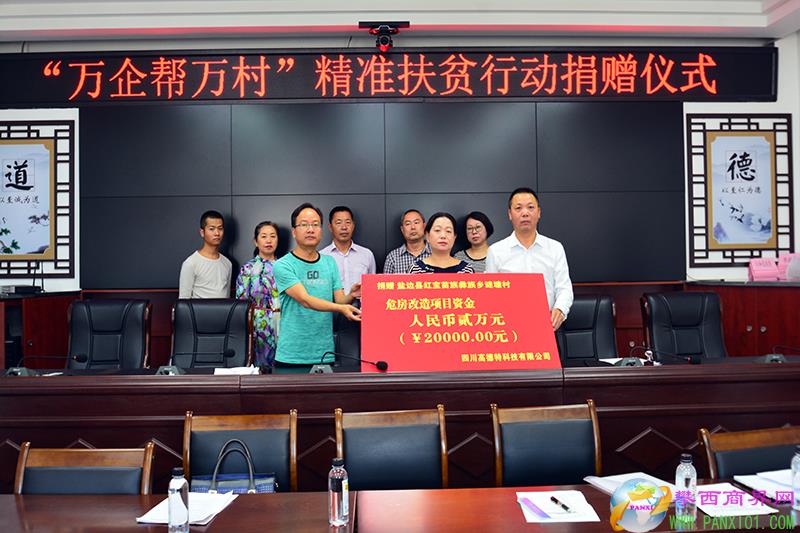 四川省扶貧基金會(huì)攀枝花市分會(huì)會(huì)長(zhǎng)黃穎(前排居中)和鹽邊縣紅寶苗族彝族鄉(xiāng)謎塘村代表陳建斌(前排左一)與四川高德特科技有限公司公司法人洪世傳(前排右一)簽署三方《捐贈(zèng)協(xié)議書》并共同接受捐贈(zèng)