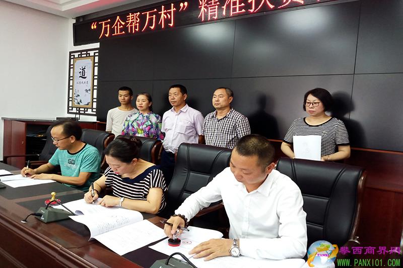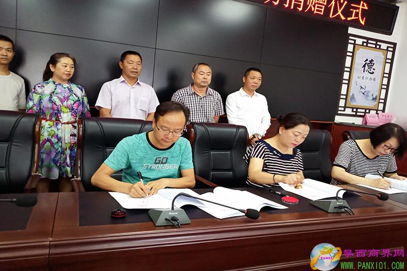 四川省扶貧基金會(huì)攀枝花市分會(huì)會(huì)長(zhǎng)黃穎(前排居中)和米易縣攀蓮鎮(zhèn)南廠村黨支部書記羅德友(前排右一)與四川安寧鐵鈦股份有限公司宣傳主辦朱輝(前排左一)簽署三方《捐贈(zèng)協(xié)議書》并共同接受捐贈(zèng)