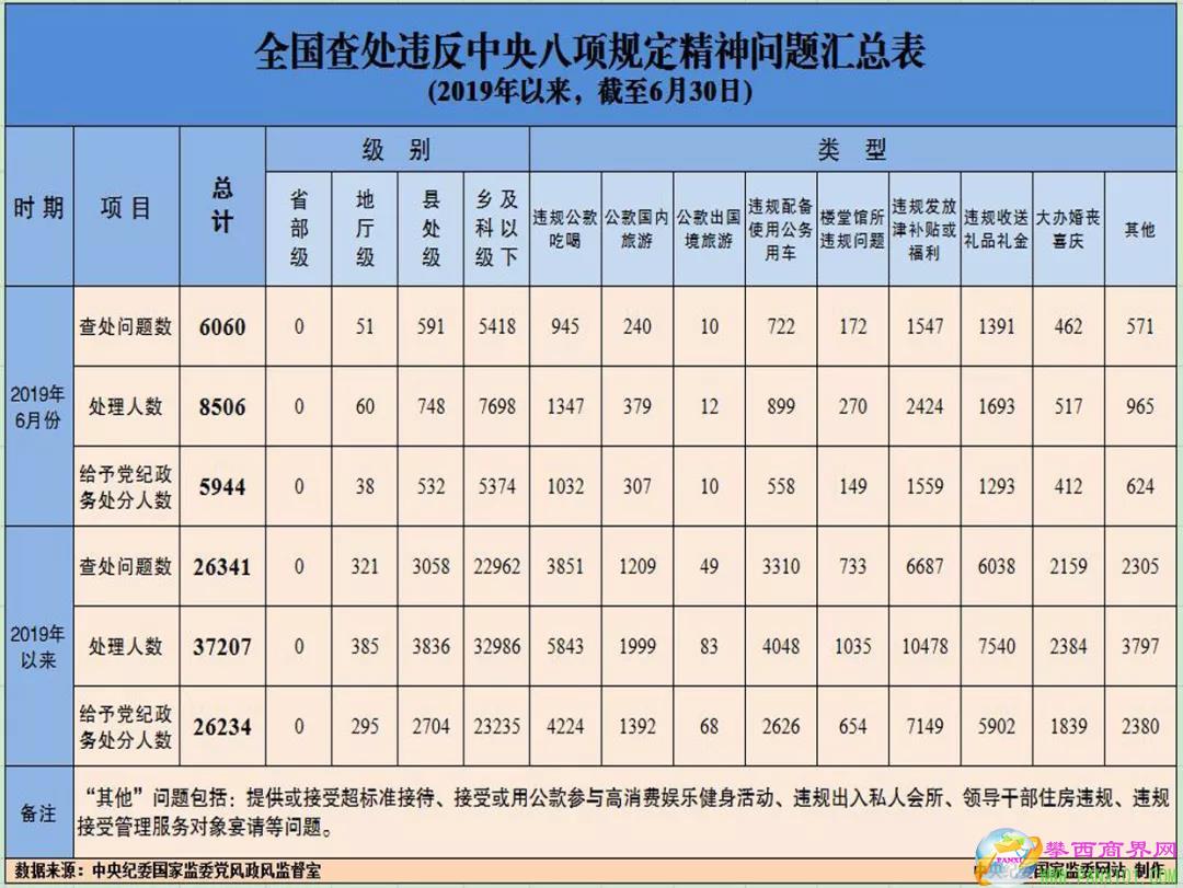 中央紀(jì)委國(guó)家監(jiān)委官方微信7月22日消息,為掌握全國(guó)貫徹落實(shí)中央八項(xiàng)規(guī)定精神情況,中央紀(jì)委國(guó)家監(jiān)委在各省區(qū)市和新疆生產(chǎn)建設(shè)兵團(tuán)、各中央和國(guó)家機(jī)關(guān)、各中央企業(yè)和中央金融企業(yè)等建立了落實(shí)中央八項(xiàng)規(guī)定精神情況月報(bào)制度。2019年以來(lái),截至6月30日,全國(guó)查處違反中央八項(xiàng)規(guī)定精神問(wèn)題情況如下: