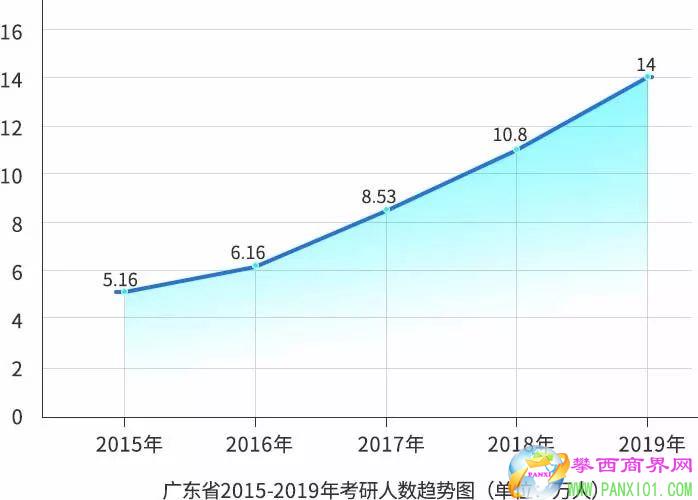 據(jù)不完全統(tǒng)計(jì):廣東考研人數(shù)在過去的5年里持續(xù)增長(zhǎng),幾乎漲了兩倍,2017年,更是以38.5%的增幅位居全國(guó)第一。早在2018年兩會(huì)期間,就有代表提出“要增加廣東高校研究生指標(biāo)”。2019年,廣東省報(bào)名人數(shù)約為14萬,比去年多了3.2萬,增長(zhǎng)了30%。