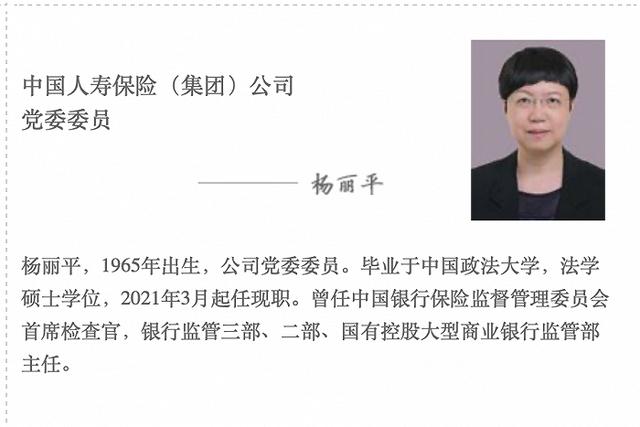 據國壽官網介紹,楊麗平,1965年生人,現(xiàn)年56歲,畢業(yè)于中國政法大學,法學碩士學位,自2021年3月起就職國壽集團。楊麗平曾任銀保監(jiān)會首席檢查官,銀行監(jiān)管三部、二部、國有控股大型商業(yè)銀行監(jiān)管部主任。