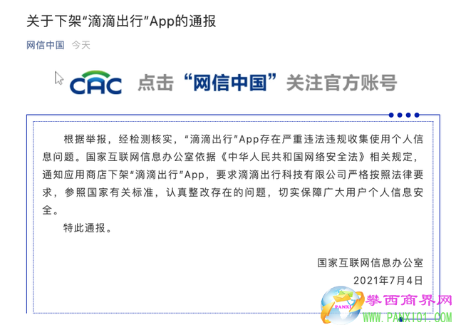 根據(jù)舉報(bào),經(jīng)檢測(cè)核實(shí),“滴滴出行”App存在嚴(yán)重違法違規(guī)收集使用個(gè)人信息問題。國(guó)家互聯(lián)網(wǎng)信息辦公室依據(jù)《中華人民共和國(guó)網(wǎng)絡(luò)安全法》相關(guān)規(guī)定,通知應(yīng)用商店下架“滴滴出行”App,要求滴滴出行科技有限公司嚴(yán)格按照法律要求,參照國(guó)家有關(guān)標(biāo)準(zhǔn),認(rèn)真整改存在的問題,切實(shí)保障廣大用戶個(gè)人信息安全。