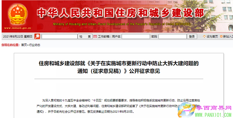 為深入貫徹黨的十九屆五中全會精神和“十四五”規(guī)劃綱要部署要求,指導(dǎo)各地積極穩(wěn)妥實施城市更新行動,防止沿用過度房地產(chǎn)化的開發(fā)建設(shè)方式、大拆大建、急功近利等問題,住房和城鄉(xiāng)建設(shè)部研究起草了《關(guān)于在實施城市更新行動中防止大拆大建問題的通知》,并于日前向社會公開征求意見。意見反饋截止日期為2021年8月20日。