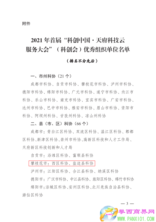 攀西商界網(wǎng)報道(記者 熊毅)12月28日,四川省科協(xié)對2021年首屆“科創(chuàng)中國·天府科技云服務(wù)大會”(科創(chuàng)會)涌現(xiàn)出的團結(jié)協(xié)作、執(zhí)行有力、務(wù)實高效的優(yōu)秀組織單位進行通報表揚,其中攀枝花市西區(qū)科協(xié)被評為優(yōu)秀組織單位。