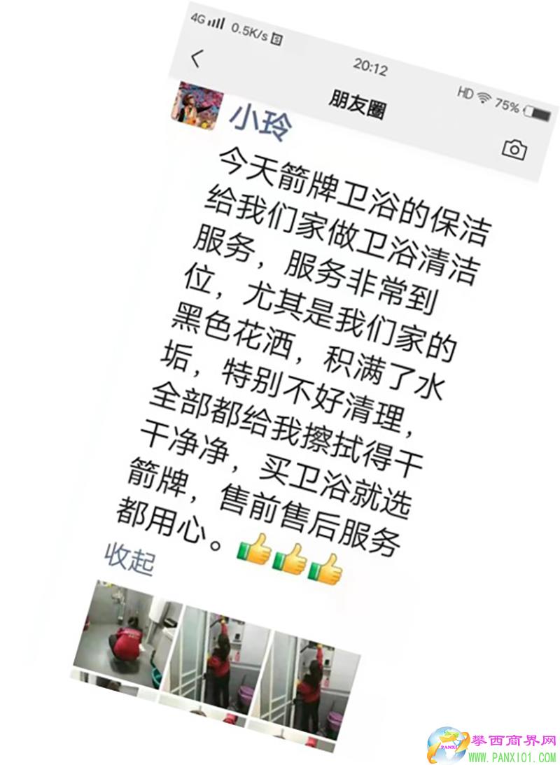 攀西商界網(wǎng)報道(記者 熊毅)“我們家的黑色花灑積滿了水垢,特別不好清理,箭牌衛(wèi)浴的保潔上門全部給我擦拭得干干凈凈,賣衛(wèi)浴就選箭牌,售前售后服務都用心!”用戶小玲在微信朋友圈分享了使用箭牌衛(wèi)浴的體驗。“品質(zhì)至上,用心服務”就是箭牌衛(wèi)浴的品牌形象。5月10日,作為箭牌衛(wèi)浴在攀枝花唯一一家總代理攀枝花箭發(fā)建材有限公司同樂旗艦店盛大開業(yè)并在同樂喜事匯舉行答謝晚宴,受到攀枝花工商界高度關注。
