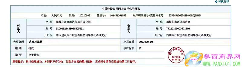 據(jù)了解,這是攀枝花市金凱達(dá)貿(mào)易公司剛剛挺過停工復(fù)產(chǎn)的陣痛之時(shí),企業(yè)領(lǐng)導(dǎo)層毅然決定為西區(qū)抗疫再出錢再出力,第一時(shí)間將20萬元的“抗疫”捐款轉(zhuǎn)入西區(qū)慈善會(huì)的專用賬戶里。
