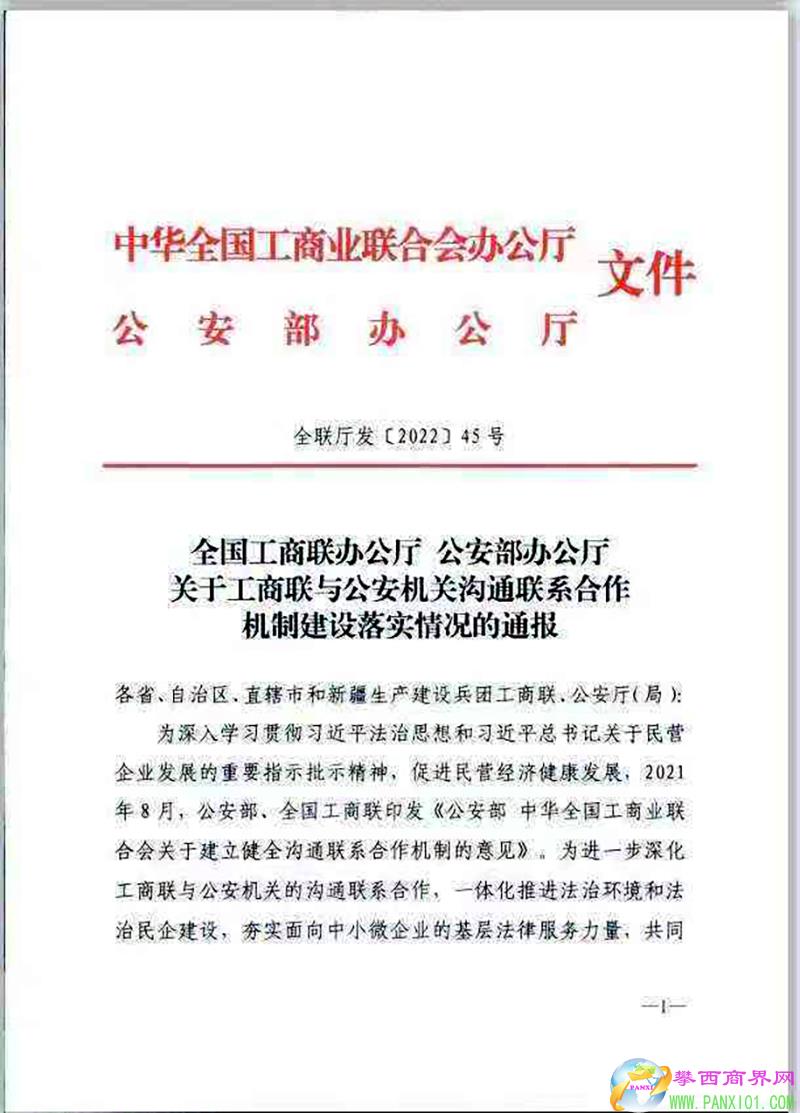 攀西商界網(wǎng)報(bào)道(攀枝花市工商聯(lián) 供稿)近日,全國工商聯(lián)辦公廳、公安部辦公廳聯(lián)合印發(fā)《關(guān)于工商聯(lián)與公安機(jī)關(guān)溝通聯(lián)系合作機(jī)制建設(shè)落實(shí)情況的通報(bào)》,通報(bào)了全國100對工商聯(lián)與公安機(jī)關(guān)溝通聯(lián)系合作機(jī)制典型事例(2021-2022),四川省有3對入選,攀枝花市工商聯(lián)與攀枝花市公安局共建溝通聯(lián)系合作機(jī)制做法榜上有名,被列為典型事例獲通報(bào)表揚(yáng)。