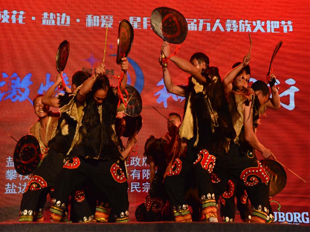 火把節(jié)這天,周邊元謀、永仁、龍街等地的山民都挑著自己的山貨、土貨,趕著騾馬,跋山涉水來到趙家店,他們搭起帳篷,支起鍋灶,一串串山貨和一碗碗香氣撲鼻的牛羊湯鍋讓過往的人們流連忘返。中午,在山上坡上,彝家人民支起磨秋,只見一對對青年男女在磨秋兩頭你上我下,人群中傳出一陣陣喝彩聲、歡笑聲。夜晚,在稍有平坦的山坡上,一堆堆篝火燃了起來,彝家小伙撥弄著三弦月琴,姑娘們手牽手圍著火堆隨一陣陣弦聲跳了起來,烈烈的火焰竄得老高老高,映紅了年青人的面孔。尊敬的客人,如果你在場的話,你一定會不顧一切地擠進人群,牽起彝家姑娘的手,圍著篝火,跳到天亮。