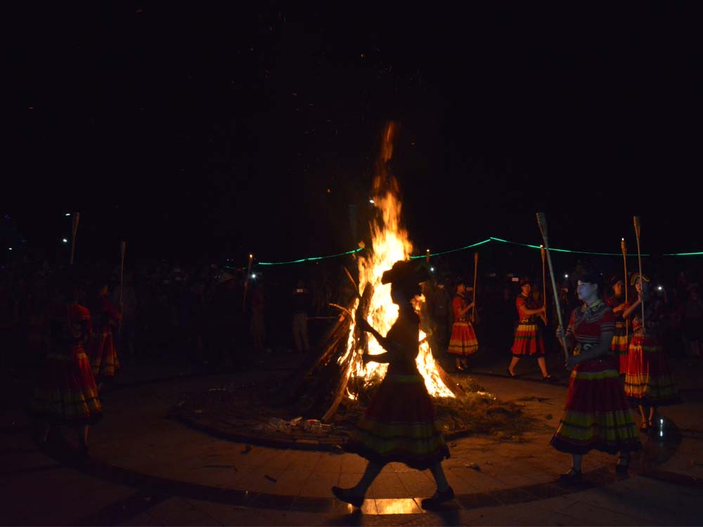 為了紀念這個難忘的日子,每年六月二十五日這天下午,彝族村寨的人們都要點燃起松明火把,用這熊熊燃燒的火把去照耀四壁,燒死蚊蟲;驅邪除惡,以示吉祥幸福;同輩人互敬火把,燒掉“祝崇”,以示清潔平安。然后舉著火把把田間地頭,揮舞引蛾,撲滅害蟲。巡游之后,將火把插在田頭地角,村前開闊地帶,男女青年就圍著火把跳起歡快的“左腳 ”,老人們圍著坐火塘,打開醇香的火酒,互相敬酒,互祝吉祥。