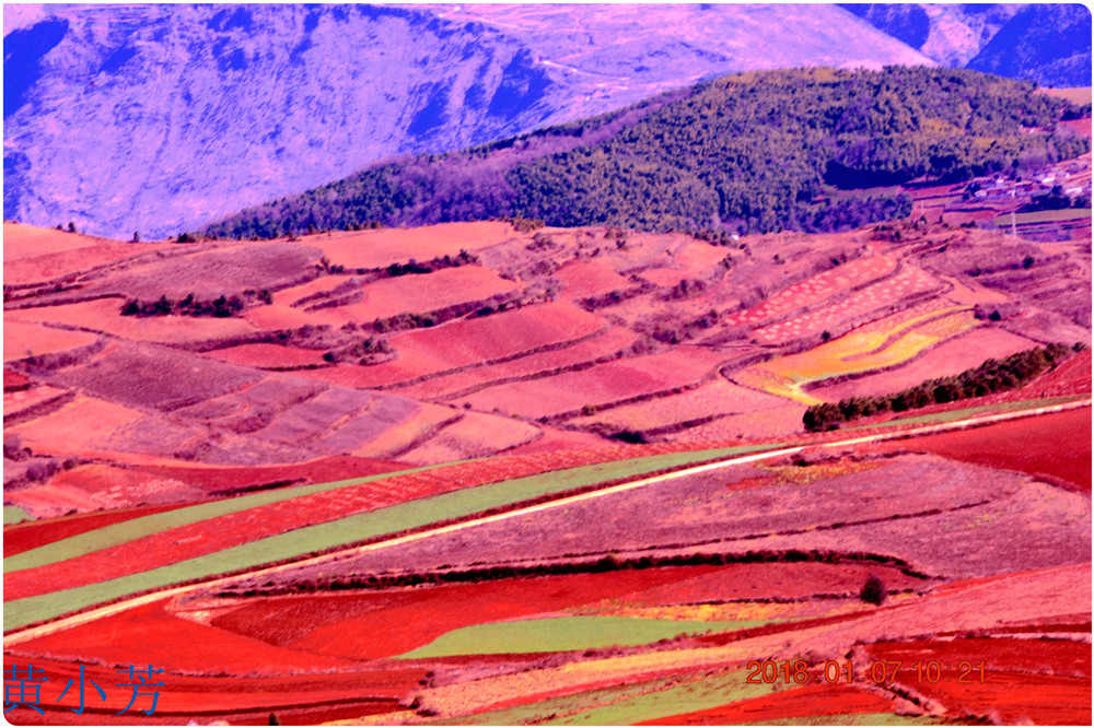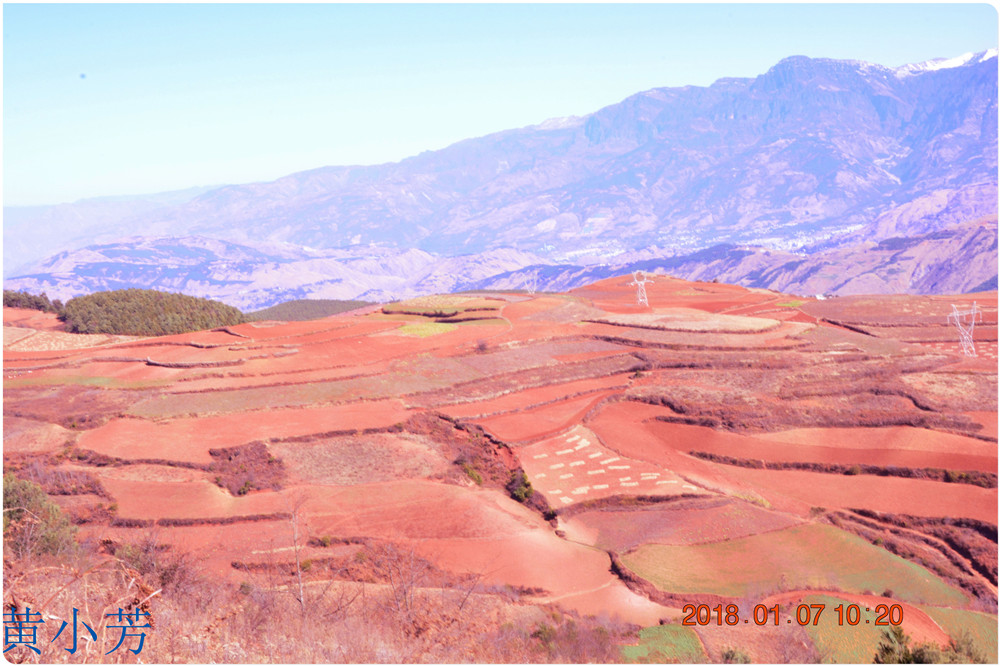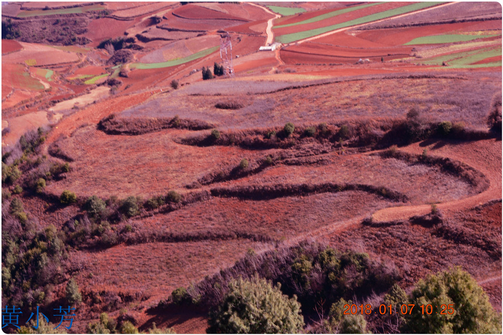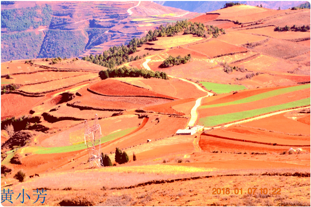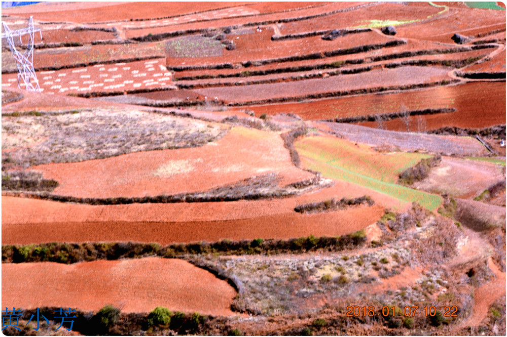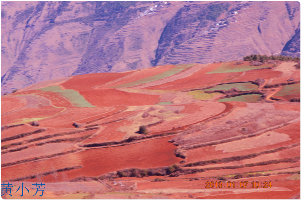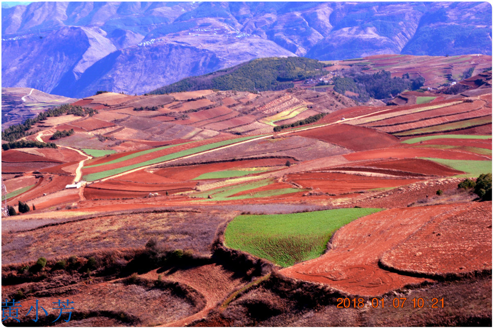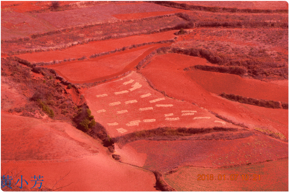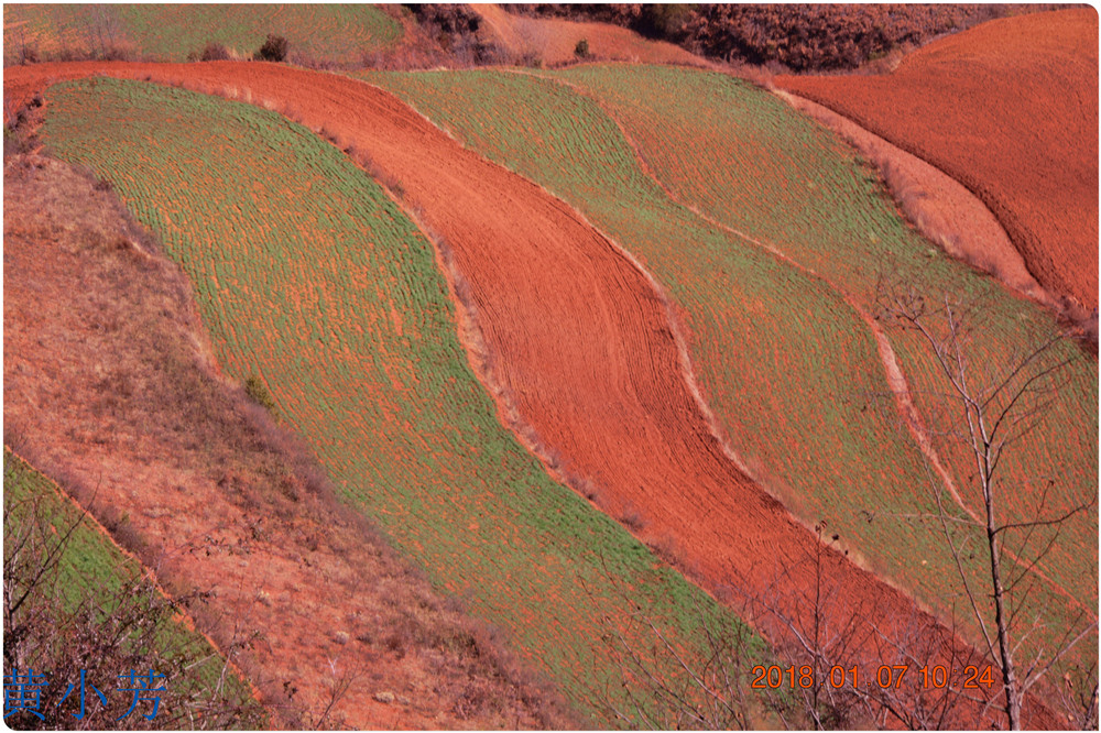 云南地處溫暖濕潤的環(huán)境,土壤里的鐵質(zhì)經(jīng)過氧化慢慢沉積下來,逐漸形成了炫目的色彩。東川紅土地指的是位于昆明市東川區(qū)西南40多公里的紅土地鎮(zhèn)、有一名叫“花石頭”(在109公里程碑處)的地方,這里方圓近百里的區(qū)域是云南紅土高原上最集中、最典型、最具特色的紅土地。每年9至12月,一部分紅土地翻根待種,另一部分紅土地已經(jīng)種上綠綠的青稞或小麥和其他農(nóng)作物,遠遠看去,就像上天涂抹的色塊,色彩絢麗斑斕,襯以藍天、白云和那變幻莫測的光束,構(gòu)成了紅土地壯觀的景色。