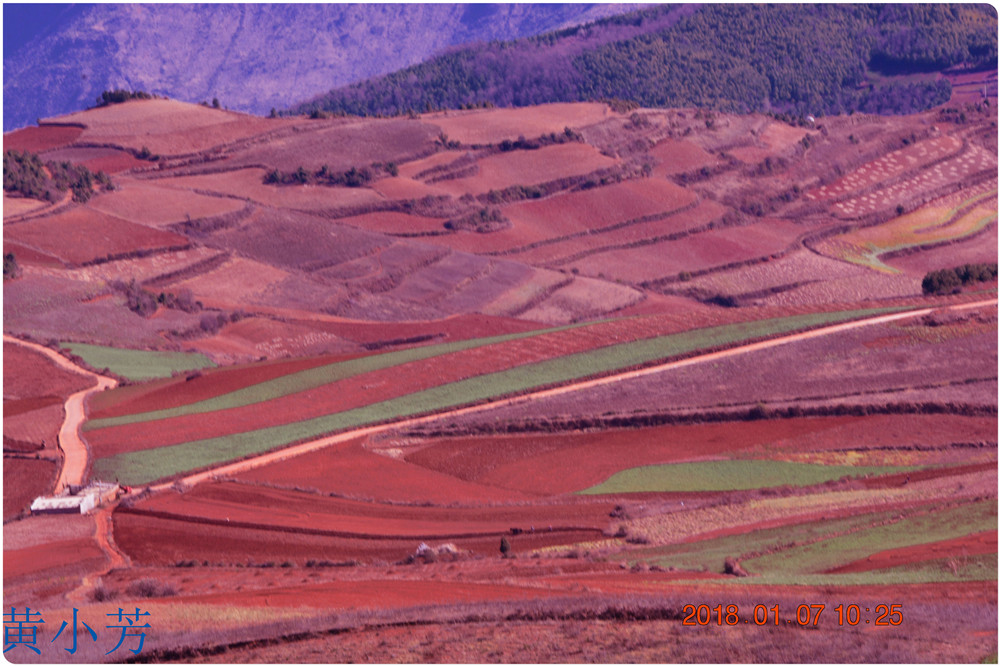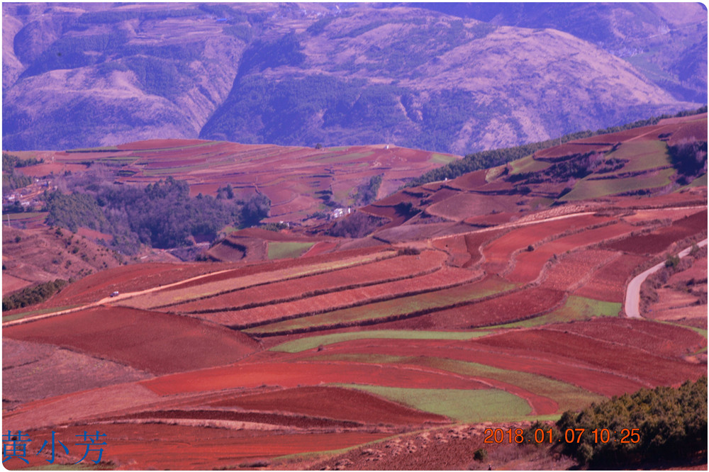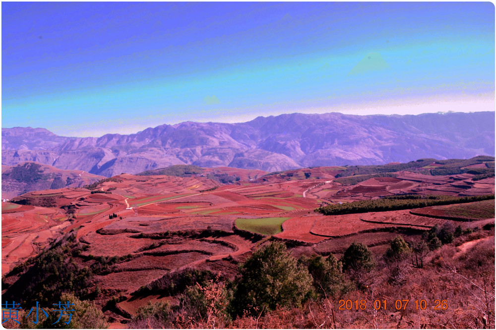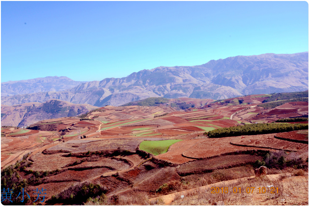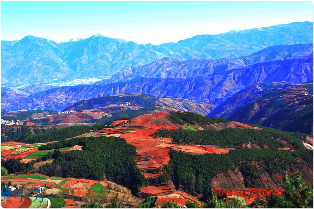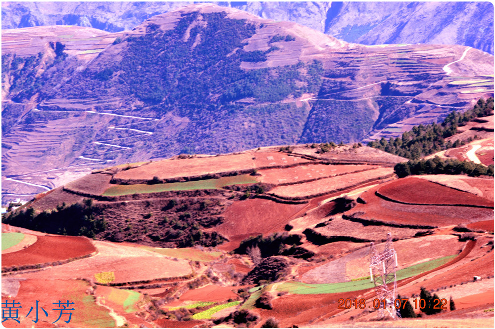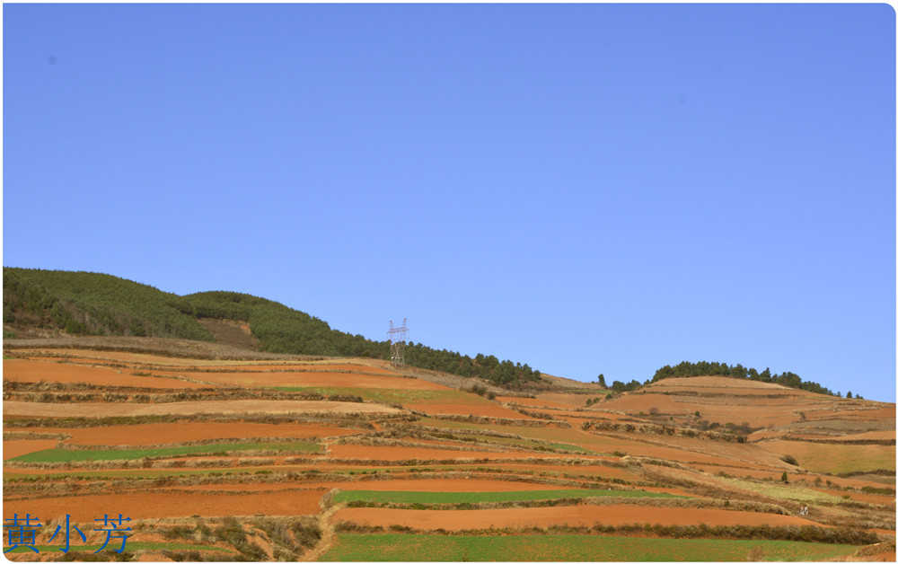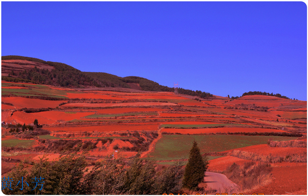云南地處溫暖濕潤的環(huán)境,土壤里的鐵質(zhì)經(jīng)過氧化慢慢沉積下來,逐漸形成了炫目的色彩。東川紅土地指的是位于昆明市東川區(qū)西南40多公里的紅土地鎮(zhèn)、有一名叫“花石頭”(在109公里程碑處)的地方,這里方圓近百里的區(qū)域是云南紅土高原上最集中、最典型、最具特色的紅土地。每年9至12月,一部分紅土地翻根待種,另一部分紅土地已經(jīng)種上綠綠的青稞或小麥和其他農(nóng)作物,遠遠看去,就像上天涂抹的色塊,色彩絢麗斑斕,襯以藍天、白云和那變幻莫測的光束,構(gòu)成了紅土地壯觀的景色。