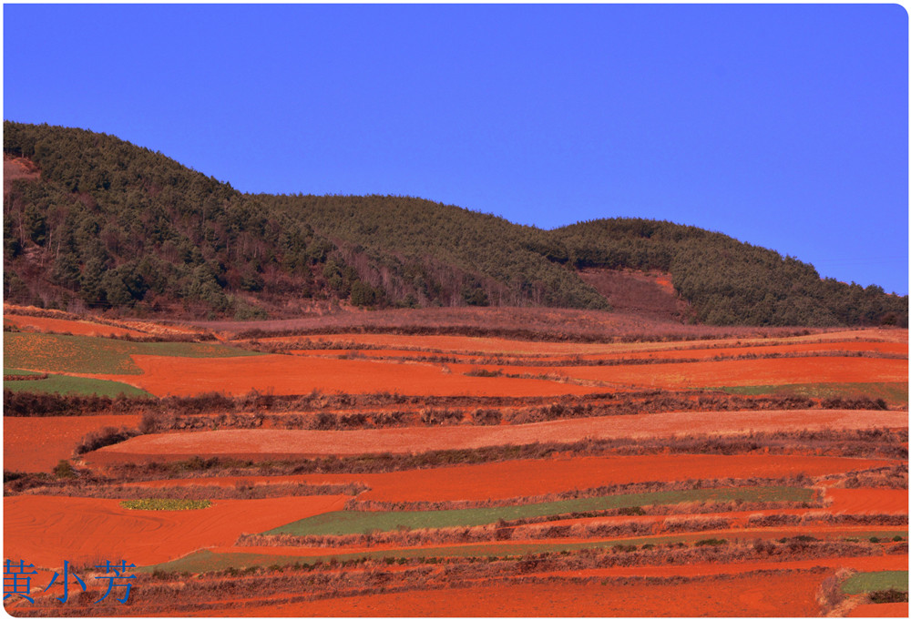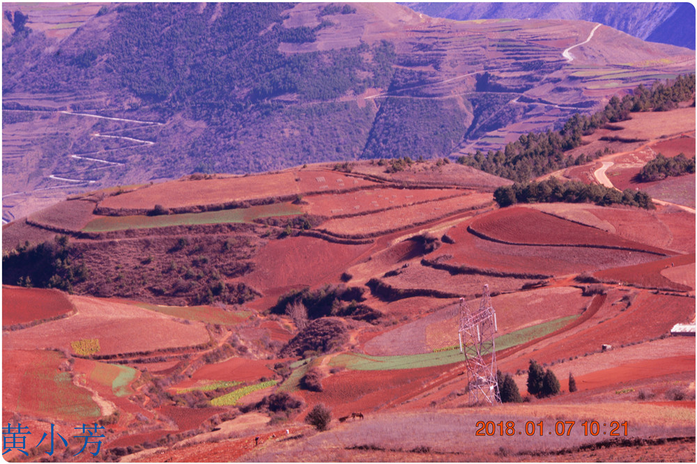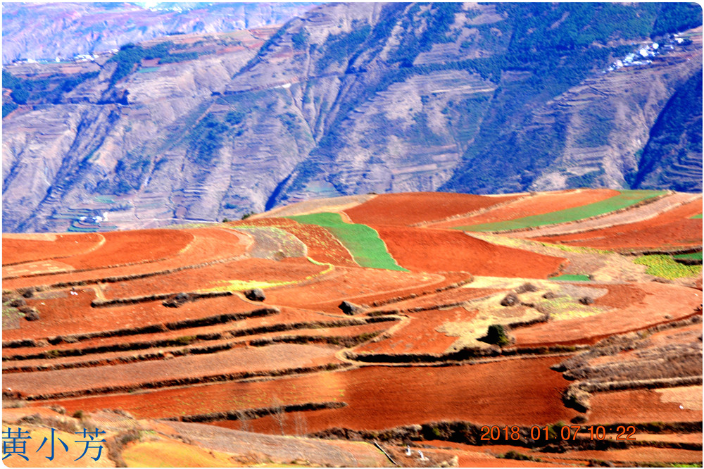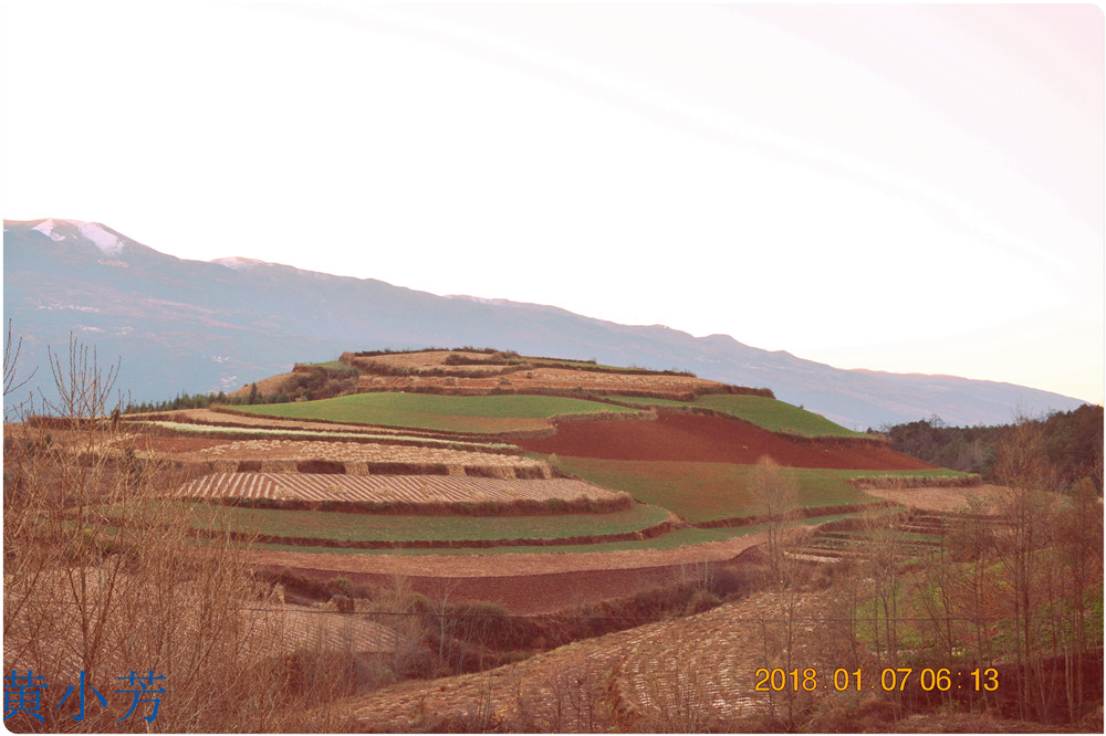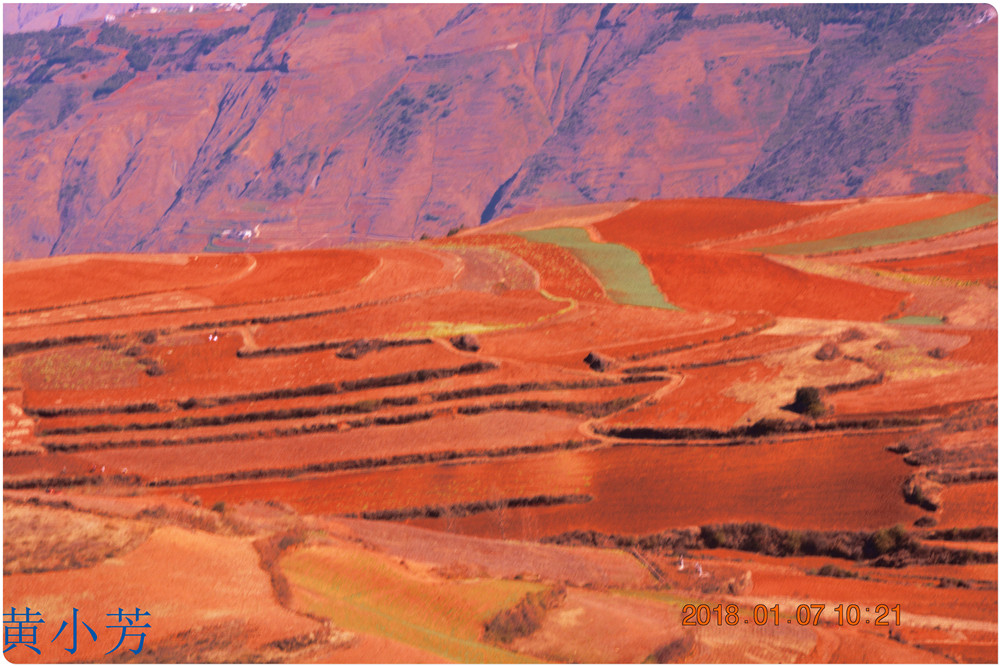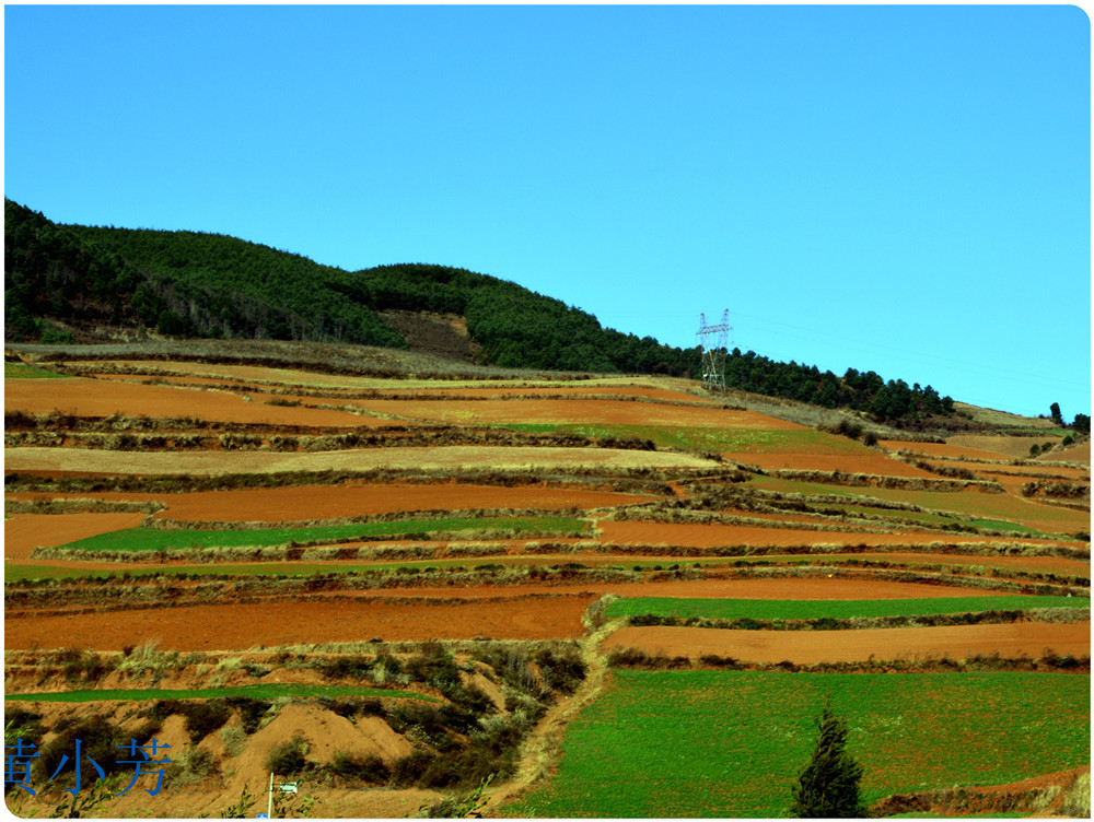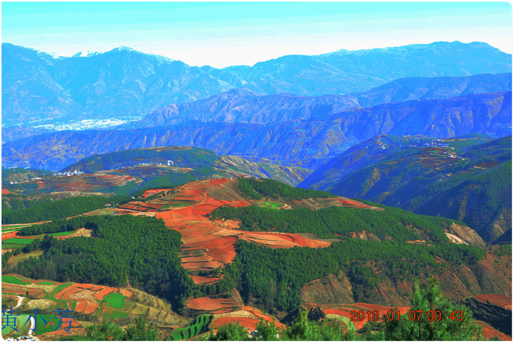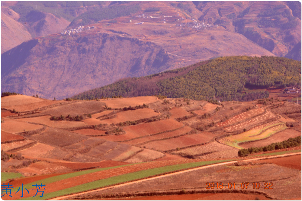 云南地處溫暖濕潤的環(huán)境,土壤里的鐵質(zhì)經(jīng)過氧化慢慢沉積下來,逐漸形成了炫目的色彩。東川紅土地指的是位于昆明市東川區(qū)西南40多公里的紅土地鎮(zhèn)、有一名叫“花石頭”(在109公里程碑處)的地方,這里方圓近百里的區(qū)域是云南紅土高原上最集中、最典型、最具特色的紅土地。每年9至12月,一部分紅土地翻根待種,另一部分紅土地已經(jīng)種上綠綠的青稞或小麥和其他農(nóng)作物,遠遠看去,就像上天涂抹的色塊,色彩絢麗斑斕,襯以藍天、白云和那變幻莫測的光束,構(gòu)成了紅土地壯觀的景色。