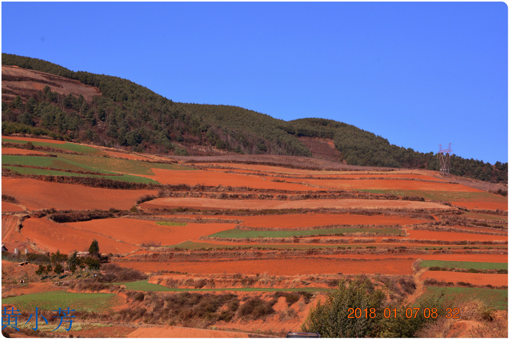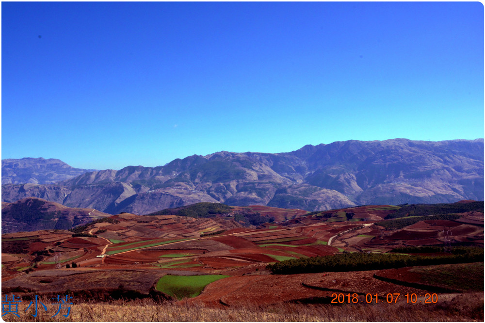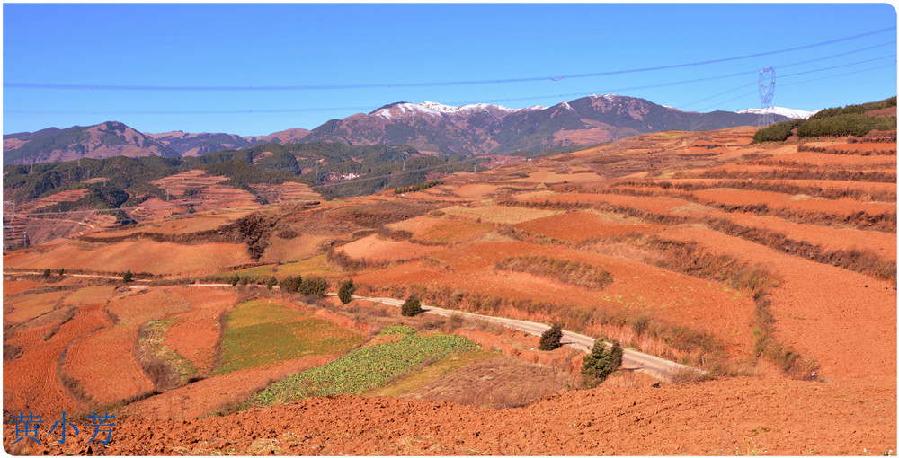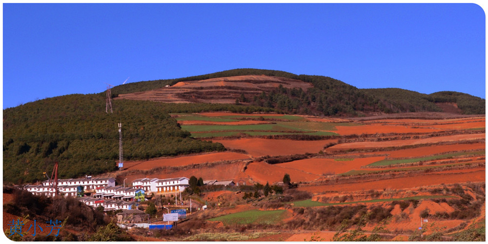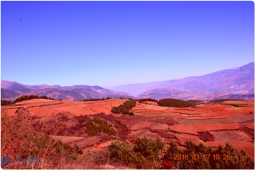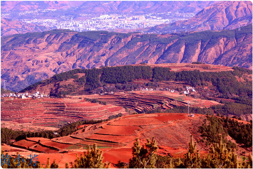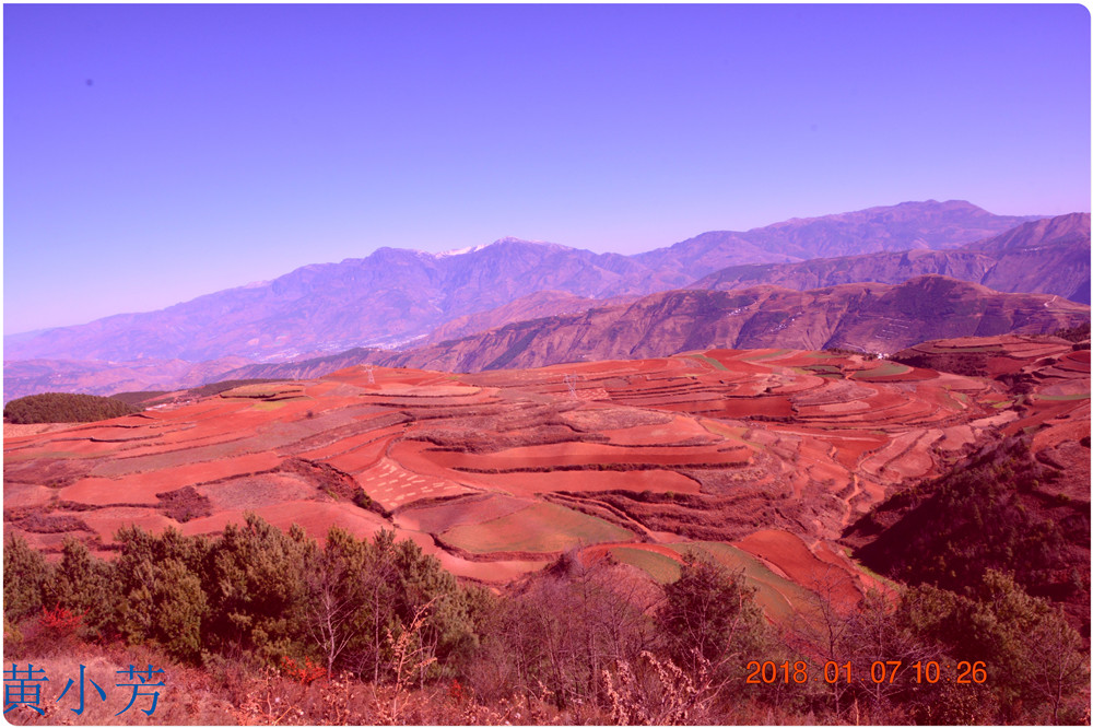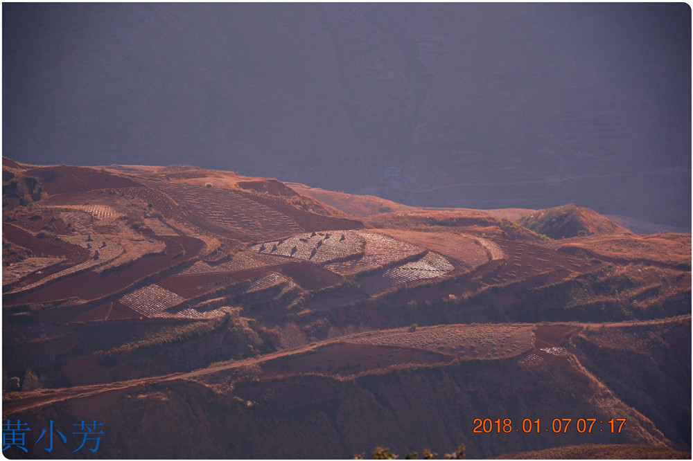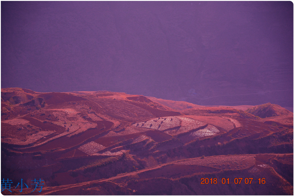云南地處溫暖濕潤的環(huán)境,土壤里的鐵質(zhì)經(jīng)過氧化慢慢沉積下來,逐漸形成了炫目的色彩。東川紅土地指的是位于昆明市東川區(qū)西南40多公里的紅土地鎮(zhèn)、有一名叫“花石頭”(在109公里程碑處)的地方,這里方圓近百里的區(qū)域是云南紅土高原上最集中、最典型、最具特色的紅土地。每年9至12月,一部分紅土地翻根待種,另一部分紅土地已經(jīng)種上綠綠的青稞或小麥和其他農(nóng)作物,遠遠看去,就像上天涂抹的色塊,色彩絢麗斑斕,襯以藍天、白云和那變幻莫測的光束,構(gòu)成了紅土地壯觀的景色。