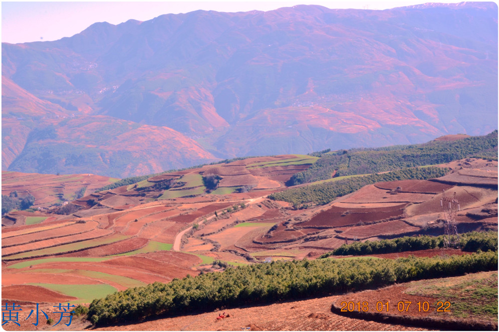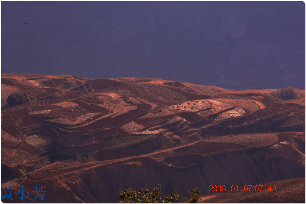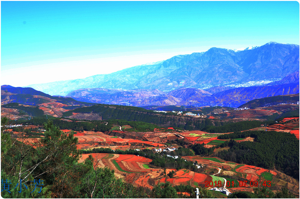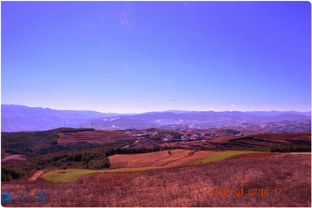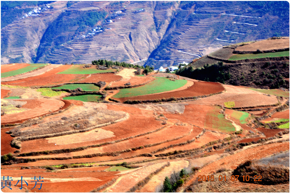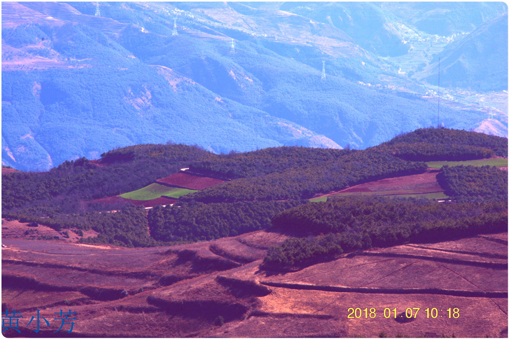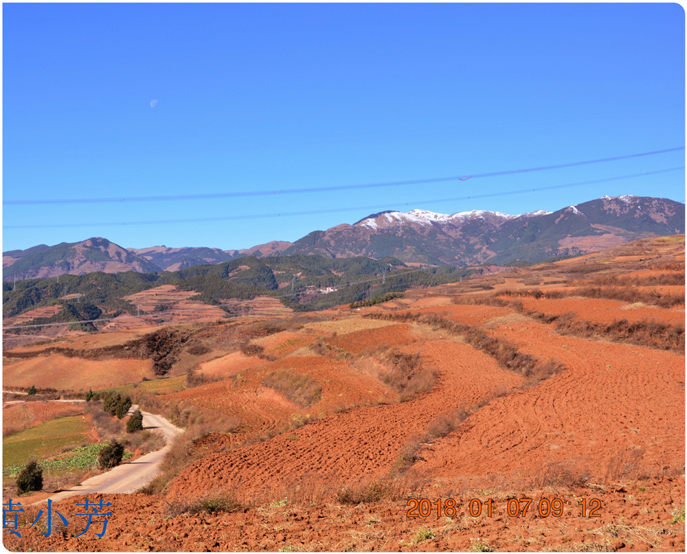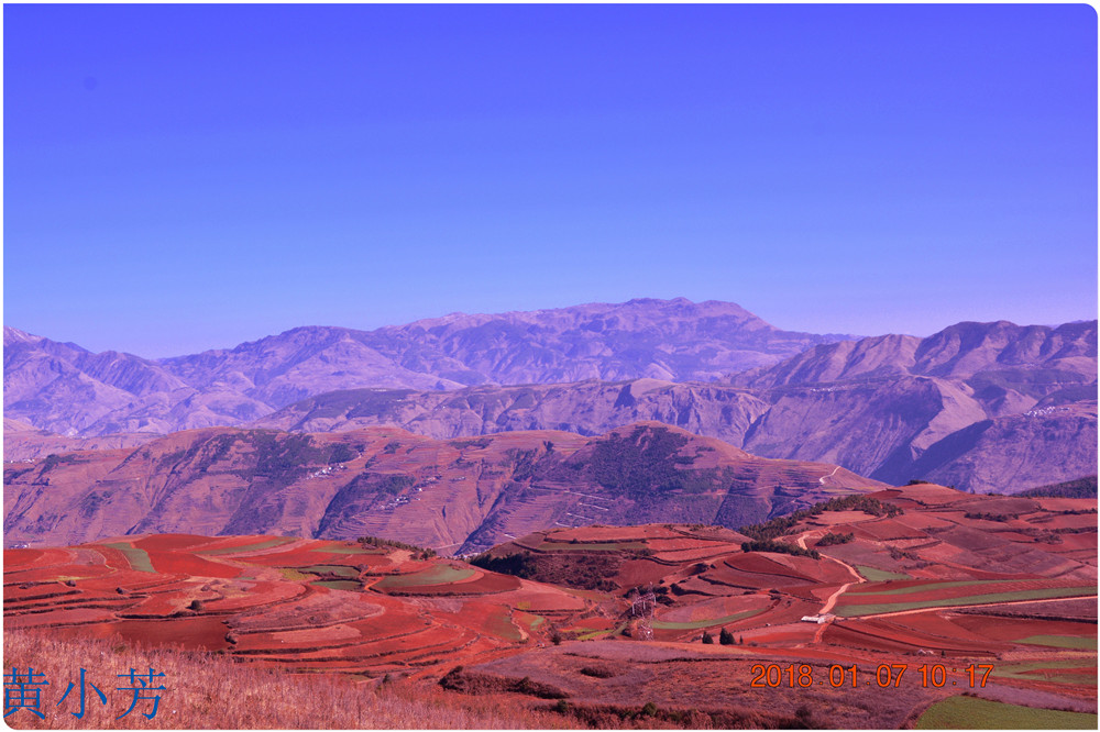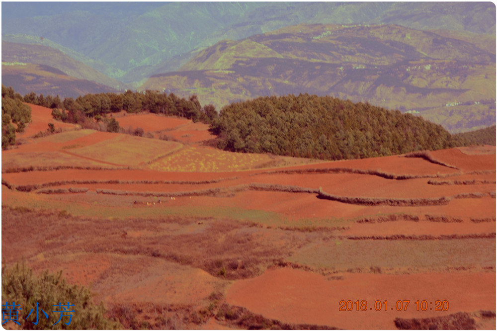 云南地處溫暖濕潤的環(huán)境,土壤里的鐵質(zhì)經(jīng)過氧化慢慢沉積下來,逐漸形成了炫目的色彩。東川紅土地指的是位于昆明市東川區(qū)西南40多公里的紅土地鎮(zhèn)、有一名叫“花石頭”(在109公里程碑處)的地方,這里方圓近百里的區(qū)域是云南紅土高原上最集中、最典型、最具特色的紅土地。每年9至12月,一部分紅土地翻根待種,另一部分紅土地已經(jīng)種上綠綠的青稞或小麥和其他農(nóng)作物,遠遠看去,就像上天涂抹的色塊,色彩絢麗斑斕,襯以藍天、白云和那變幻莫測的光束,構(gòu)成了紅土地壯觀的景色。