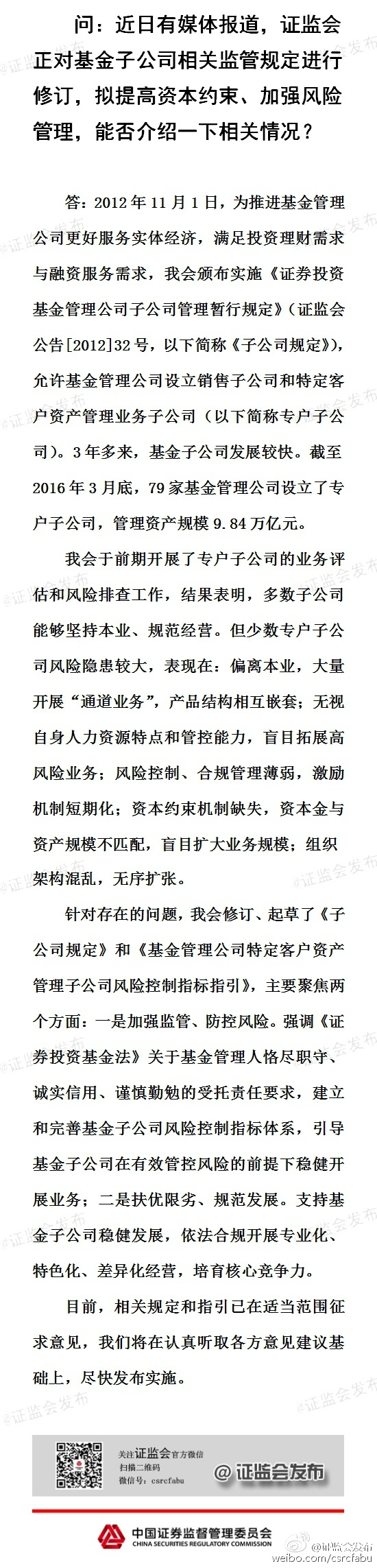 • 2016年05月20日 16:38 來(lái)源:鳳凰財(cái)經(jīng) 鳳凰財(cái)經(jīng)訊 5月20日消息,針對(duì)近期有報(bào)道稱證監(jiān)會(huì)擬對(duì)基金公司子公司相關(guān)監(jiān)管進(jìn)行修訂,證監(jiān)會(huì)新聞發(fā)言人鄧舸20日表示,2012年證監(jiān)會(huì)證券投資基金公司子公司暫行規(guī)定,允許基金公司設(shè)立專戶子公司,三年多來(lái),基金子公司發(fā)展較快,79家基金公司設(shè)立了專戶子公司,管理資產(chǎn)規(guī)模9.84萬(wàn)億元。