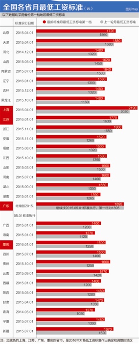 但2016年,對(duì)最低工資標(biāo)準(zhǔn)作出確定和調(diào)整的省份則大大減少。據(jù)21世紀(jì)經(jīng)濟(jì)報(bào)道記者不完全統(tǒng)計(jì),截至今年5月14日,全國(guó)僅上海、江蘇、重慶、廣東等四省市對(duì)今年最低工資作了明確,且江蘇、重慶更多是對(duì)2014年發(fā)布的最低工資標(biāo)準(zhǔn)作出調(diào)整。