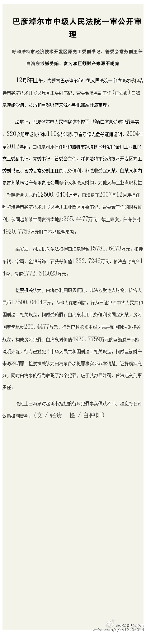 @法治巴彥淖爾官方微博12月8日消息,12月8日上午,內(nèi)蒙古巴彥淖爾市中級人民法院一審依法對呼和浩特市經(jīng)濟(jì)技術(shù)開發(fā)區(qū)金川工業(yè)園區(qū)黨工委副書記、黨委書記、管委會主任、呼和浩特市經(jīng)濟(jì)技術(shù)開發(fā)區(qū)黨工委副書記、管委會常務(wù)副主任(正處級)白海泉涉嫌受賄、貪污和巨額財產(chǎn)來源不明犯罪案開庭審理。