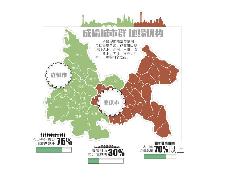 盡管目前批復(fù)方案尚未對(duì)外公布,成都市發(fā)改委相關(guān)人士告訴記者,根據(jù)測(cè)算,成渝城市群覆蓋范圍占據(jù)四川和重慶面積的30%,人口密集度是兩地的75%。以2014年兩地經(jīng)濟(jì)發(fā)展情況為例,經(jīng)濟(jì)總量更是占到了70%以上。