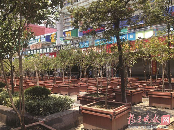 昨日上午,揚(yáng)子晚報(bào)記者在湖畔天城商業(yè)街上看到,這條商業(yè)街上共有81家店鋪,快餐店、燒烤店、超市等等應(yīng)有盡有。商業(yè)街的廣場上擺滿了綠化樹箱,每個(gè)箱子里種有一棵桂花樹。