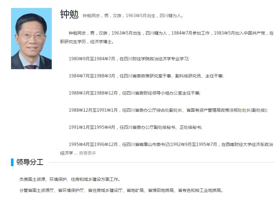 鐘勉(1963.5)曾任四川省委常委、副省長(zhǎng),云南省委副書(shū)記等職,2016年12月任貴州省政府黨組成員,2017年1月起任貴州省副省長(zhǎng)、省政府黨組成員。