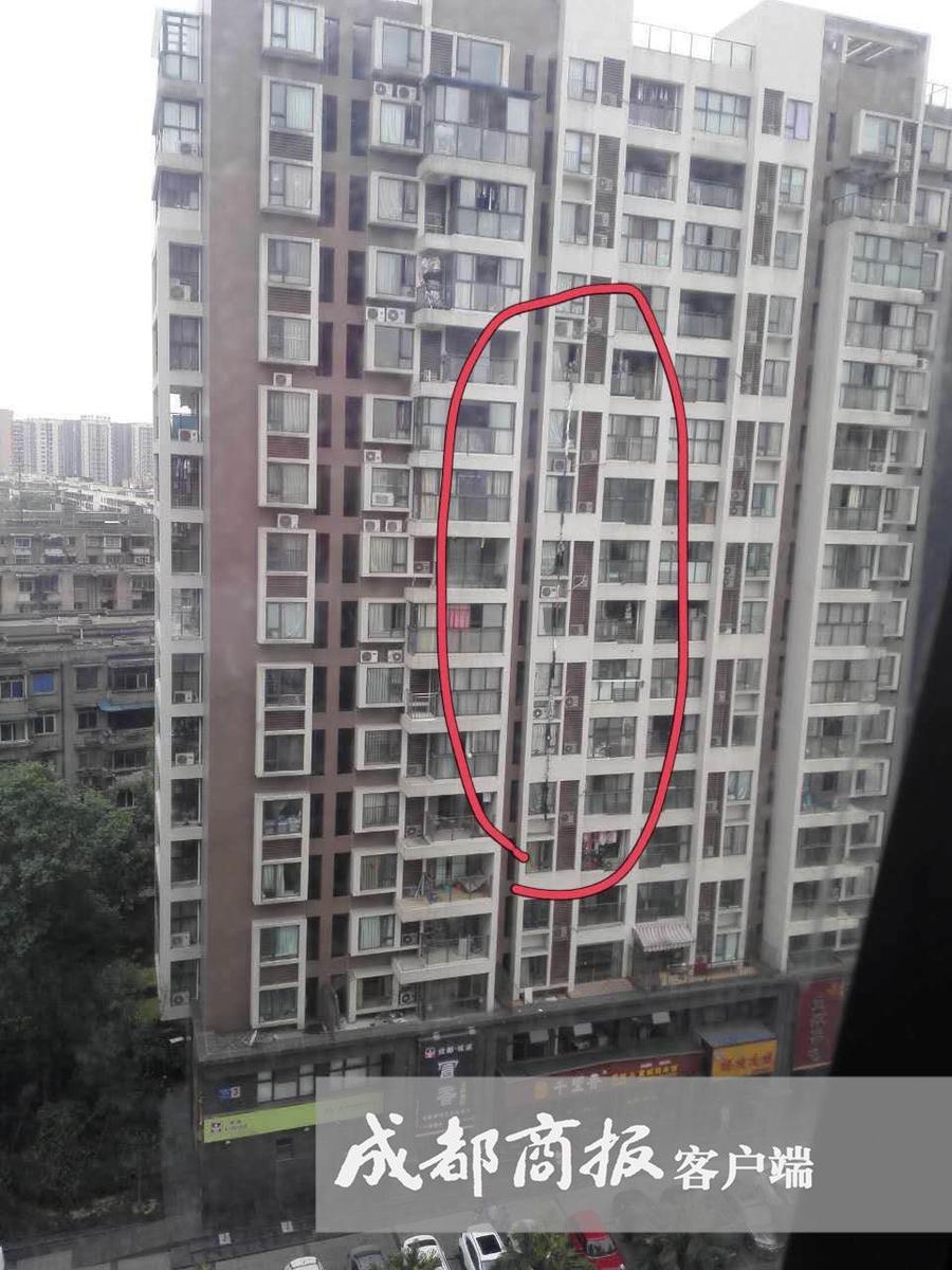 昨日上午9點(diǎn)左右,一條20多米長、由床單和衣服結(jié)成的長繩,從成都紅牌樓一小區(qū)的13樓窗戶扔下,懸掛在樓房外側(cè)。窗臺(tái)上,一名年輕女子正在不停揮動(dòng)著床單繩,向外面的人求救。