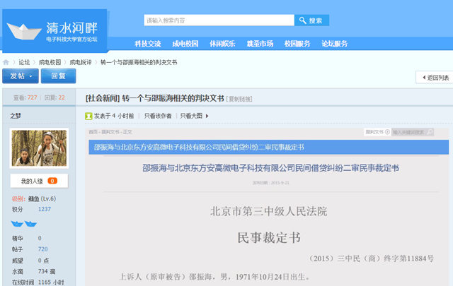 校園論壇上,有人貼出了邵振海需向項目合作方賠償30多萬元的民事裁定書。當(dāng)日,著名社交網(wǎng)站“知乎”上出現(xiàn)一個問題:《如何看待電子科大邵振海被學(xué)生曝光事件?》,引發(fā)熱議。至5月19日已收到了800多個回答,廣受關(guān)注。
