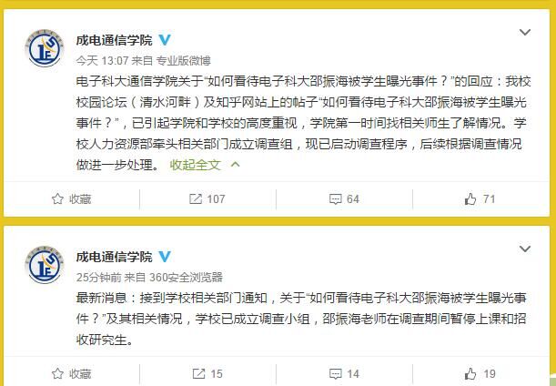 5月18日中午,邵振海所在的電子科技大學(xué)信息與工程學(xué)院的官方微博連續(xù)發(fā)布了兩條消息:13時07分稱已啟動調(diào)查程序:帖子已引起學(xué)院和學(xué)校的高度重視,學(xué)院第一時間找相關(guān)師生了解情況。學(xué)校人力資源部牽頭相關(guān)部門成立調(diào)查組,現(xiàn)已啟動調(diào)查程序,后續(xù)根據(jù)調(diào)查情況做進一步處理。僅僅過了一個多小時,14時20分稱:邵振海老師在調(diào)查期間暫停上課和招收研究生。