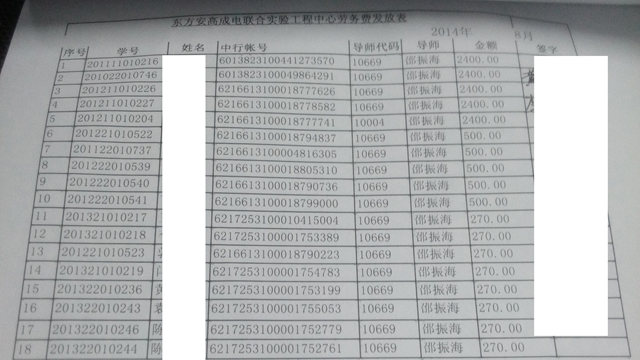 一、借學(xué)生名義斂財。套取項目經(jīng)費。比如下圖中簽字的學(xué)生,根本沒拿到所謂的勞務(wù)費,銀行卡根本沒有轉(zhuǎn)賬記錄。還揭露“2014年4月起,所有學(xué)生甚至都沒有收到一分國家補助,全被他克扣了!”